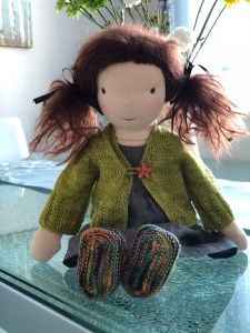 My Hazel & Poppy dolls and softies are eco-friendly heirloom quality. They are knitted with a variety of natural wools, stitched from organic 100% cotton muslin, linen or German 100% cotton jersey and stuffed with a silky corn fiber, poly-blend fiberfill or wool. Materials are specified for each individual item.